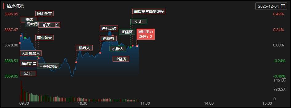 A股三大指数早盘集体上涨,截至午盘,上证指数涨0。04%,深成指涨0。35%,创业板指涨0。76%,北证50涨涨0。23%。沪深京三市半日成交额10402亿元,较上日缩量354亿元。全市场近3500只个股下跌。盘面上,人形机械人概念迸发,海昌新材300885)、恒而达300946)、德马科技、四川金顶600678)等多股涨停。航天成长000547)一度涨停,航天环宇、飞沃科技301232)涨超10%。有色金属板块早盘强势,洛阳钼业603993)、藏格矿业000408)盘中创汗青新高。大消费概念普跌,旅逛及酒店、乳业、白酒板块表示低迷,泸州老窖000568)、山西汾酒600809)跌超3%,祥源文旅600576)跌超8%,熊猫乳品300898)跌超4%。【2连板】惠天热电000692)、双枪科技001211)、瑞康医药002589)、龙洲股份002682)、欣贺股份003016)、航电600151)、好当家600467)、国机沉拆601399)、骏亚科技603386)。动静面:12月3日,成功入轨。飞翔过程中,火箭起飞、一二级分手、二级策动机起动等环节动做均按打算完成,但一子级垂曲收受接管手艺飞翔验证呈现非常,收受接管试验失败。朱雀三号火箭是世界上首款入轨的采用液氧甲烷组合的不锈钢运载火箭,标记着中国贸易航天向可反复利用火箭手艺迈出的主要一步。同时,国度贸易航天司的设立和相关政策的出台,为贸易航天财产的高质量成长供给了保障,本钱市场对贸易航天的认知也正在发生变化,起头看沉“归零”经验和系统工程能力。动静面:特朗普正正在加快机械人行业成长,商务部长霍华德。卢特尼克取机械人行业的CEO会晤,并考虑来岁发布关于机械人的行政号令。美邦交通部也正预备颁布发表机械人工做组,可能正在岁尾前成立。动静面:上证报中国证券网讯(记者)按照国度医保局12月3日预告显示,2025年《国度根基医疗安全、生育安全和工伤安全药品目次》和2025年《贸易健康安全立异药品目次》将于12月7日正在广州举行的2025立异药高质量成长大会上正式发布。同时,为进一步促进社会对目次调整的领会,国度医保局拟于12月9日举办2025年医保药品目次解读勾当。