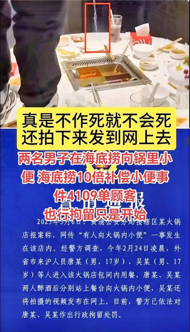 这时候若是身边有个大白人拉一把,大概这就是个令人但止步于此的醉酒。可悲的是,同为17岁的小吴不只没有,反而兴奋地掏出手机全程跟拍。仿佛这还不敷,为了所谓的“兄弟义气”或是某种扭曲的攀比心理,小吴紧随其后也向暖锅里尿了一泡,此次轮到小唐拿动手机记实下了这“高光时辰”。临走前,两人更是像是要正在疆场上留下记号一样,把桌上的盘子、杯子、筷子一股脑全扫进那锅被污染的汤底里,以至还把椅子搬到了桌上。