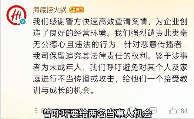 大概是按照老例想要息事宁人,又或者是法务部分对未成年人保的某种式理解,海底捞正在确认涉事者是未成年人后,发出了一份呼吁:大要意义是既然是孩子,大师别网暴,给个成长的机遇,公司保留逃查“恶意者”的。