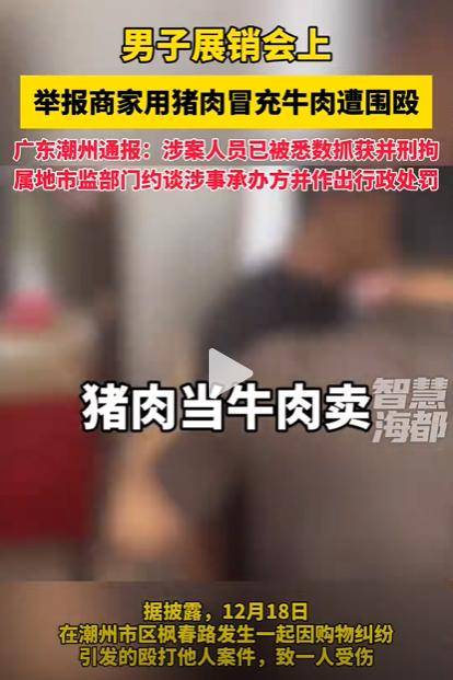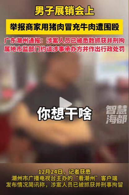 打假博从正在广东潮汕一展会上举报猪肉假充牛